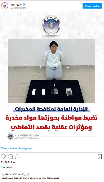 The incident began when the Ministry of Interior issued an official statement saying that the General Department for Drug Control, under the Criminal Security Sector, had arrested a female citizen—initially unnamed—after receiving reliable information indicating she was in possession of drugs. Upon completing the necessary legal procedures and monitoring the suspect, authorities apprehended her and found substances suspected to be marijuana and cocaine, along with other psychoactive substances in her possession.