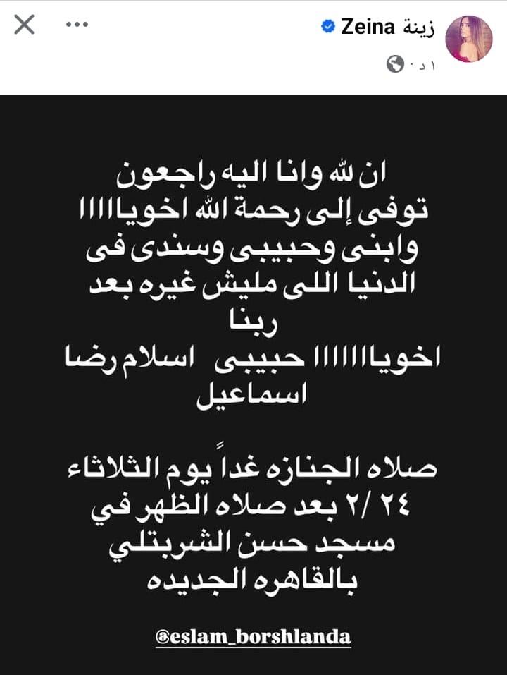 «إنا لله وإنا إليه راجعون.. توفى إلى رحمة الله أخويااااا وابني وحبيبي وسندي في الدنيا اللي مليش غيره بعد ربنا.. أخويا حبيبي إسلام رضا إسماعيل».