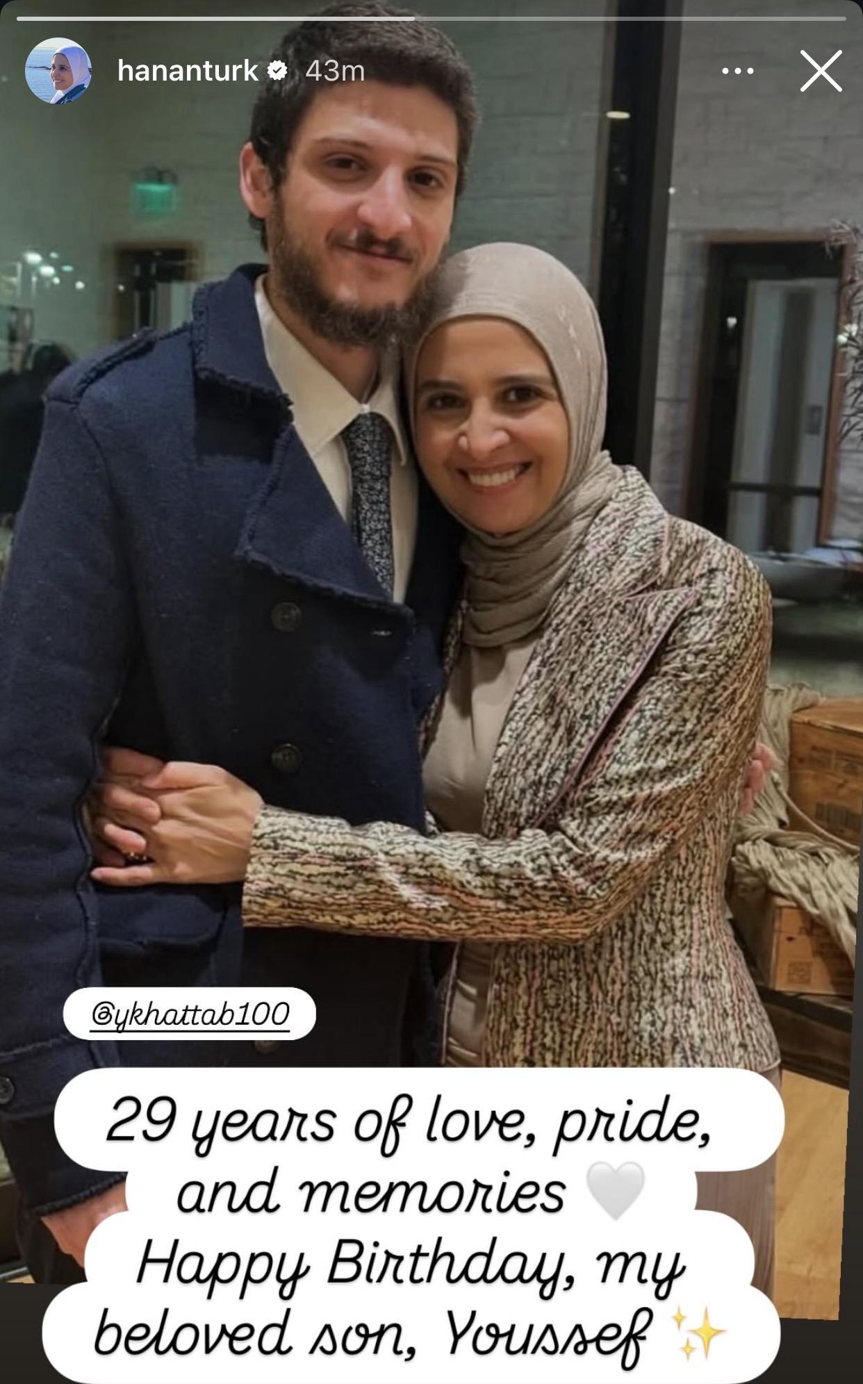حرصت الفنانة حنان ترك على تهنئة ابنها يوسف بمناسبة عيد ميلاده الـ29، حيث نشرت صورة تجمعها به عبر حسابها على إنستجرام وعلّقت:
