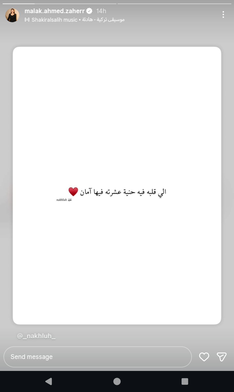 نشرت الفنانة ملك أحمد زاهر رسالة جديدة عبر خاصية الاستوري على حسابها بموقع إنستجرام 📱، كتبت فيها عبارة تحمل طابعًا عاطفيًا: