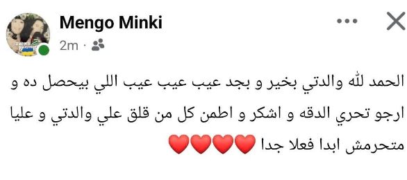 "الحمدلله والدتي بخير، وبجد عيب اللي بيحصل ده، وأرجو تحري الدقة، وأشكر وأطمن كل من قلق على والدتي وعليا، متحرمش أبدا فعلا جدا".