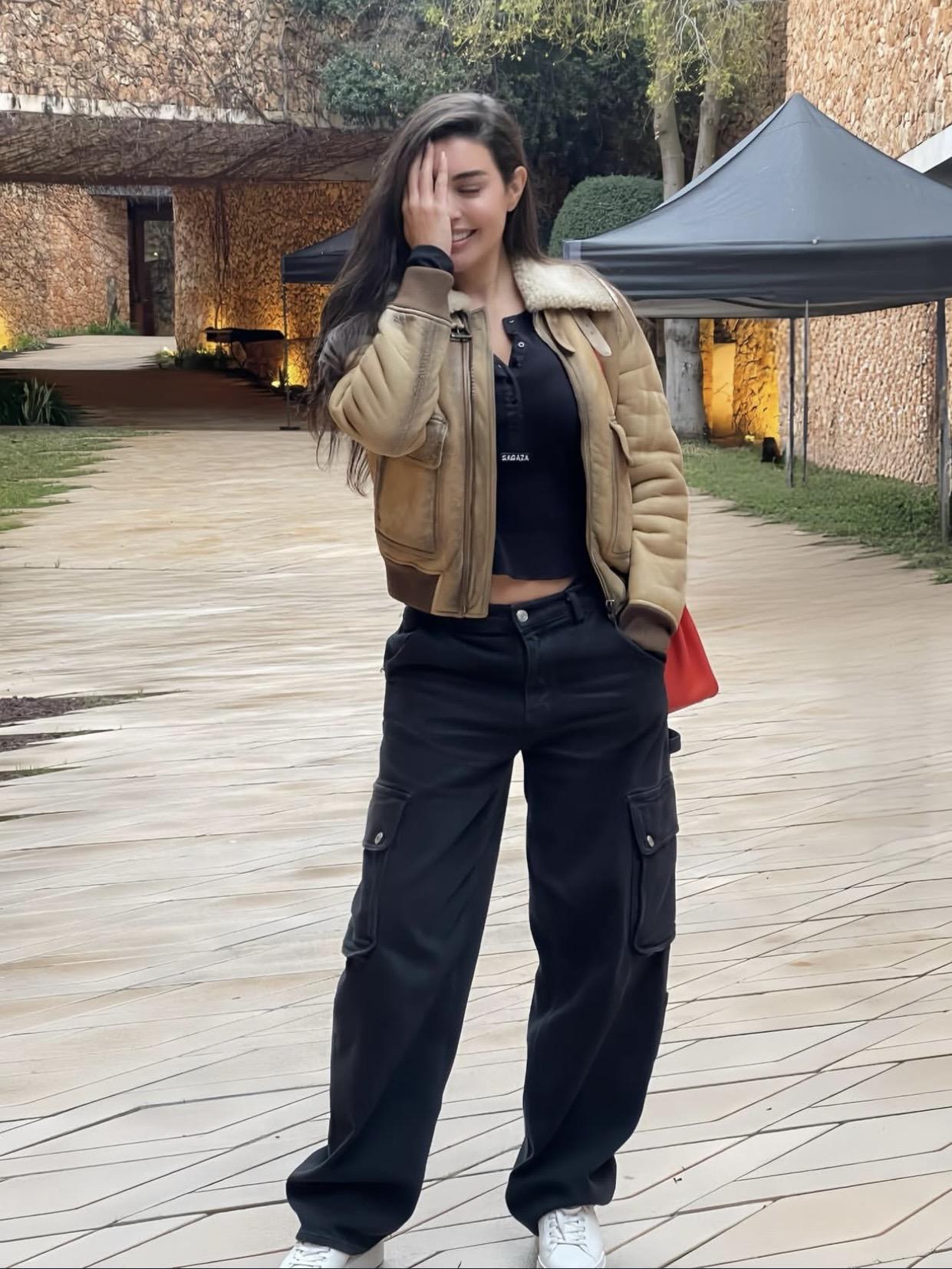 👖 جاءت الإطلالة مكونة من جاكيت قصير بلون البيج بلمسة دافئة، نسّقته مع توب أسود وبنطال كارغو واسع باللون الأسود، ما منحها مظهرًا شبابيًا عصريًا يعكس أحدث صيحات الموضة العالمية.