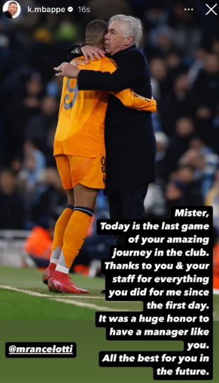 كتب النجم الفرنسي كيليان مبابي، لاعب ريال مدريد الإسباني، رسالة وداع مؤثرة لمدربه الإيطالي كارلو أنشيلوتي، بالتزامن مع إعلان رحيل الأخير عن تدريب الفريق الملكي عقب نهاية الموسم الحالي.