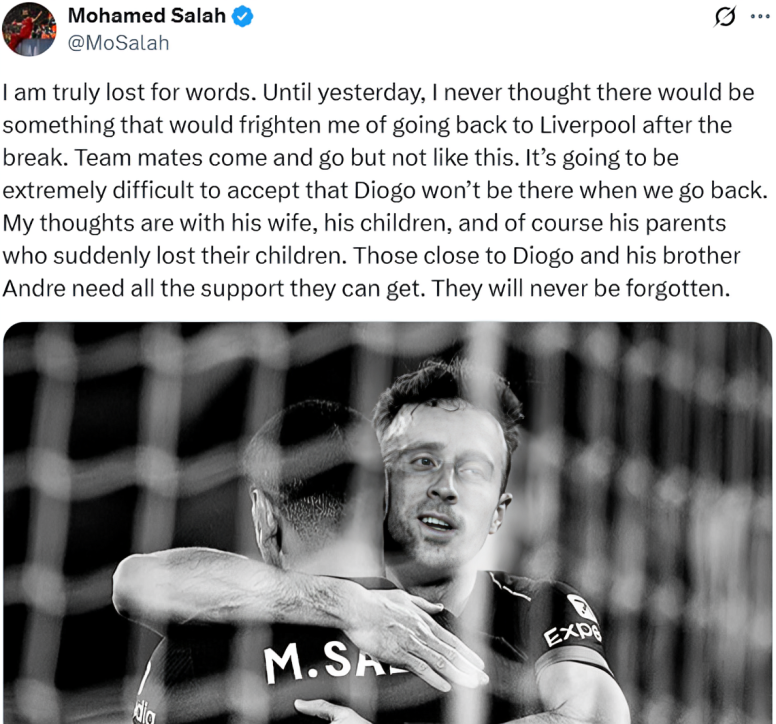 ونشر محمد صلاح عبر حسابه الرسمي على منصة "تويتر" صورة مؤثرة تجمعه بجوتا أثناء احتفالهما معًا بأحد الأهداف، وكتب كلمات حزينة وصف فيها عمق الفاجعة التي يعيشها:
