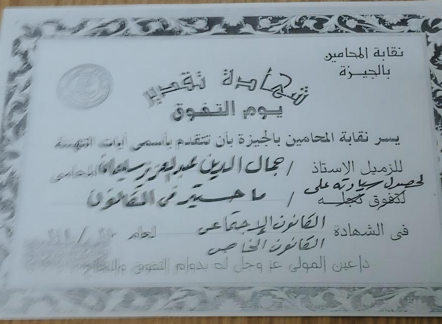شهادة تكريم من نقابة المحامين بالبحيرة تقديرًا لتفوقه المهني